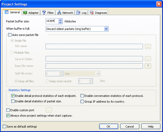 If checked, Colasoft Capsa will always open the Project Settings dialog every time when you start a new capture.