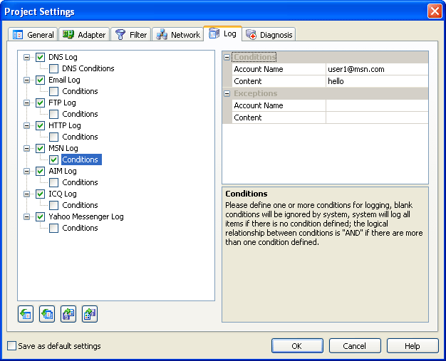 and Content. Blank conditions will be ignored by system, system will log all items if there is no condition defined.