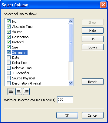 Colasoft Capsa displays captured data with corresponding column headings, you can select more columns to show more information, or alter the position of columns.