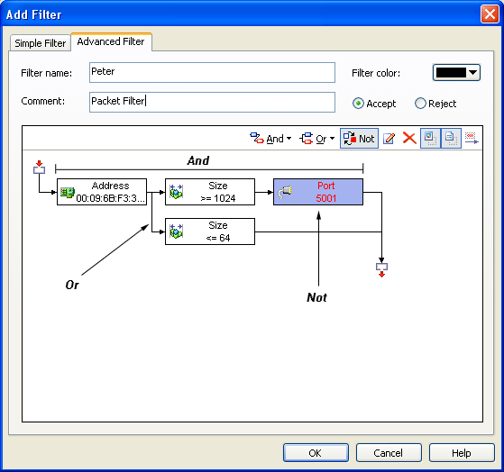 | Not | All packets except those matching the criteria inside this logical Not filter will now be passed to the next stage. |