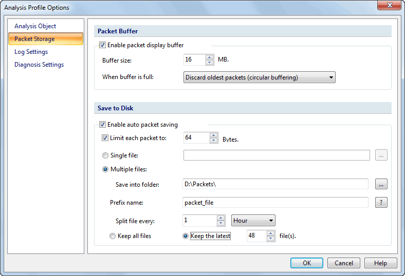 You can read Analysis Profile to learn how to open the Packet Storage dialog.