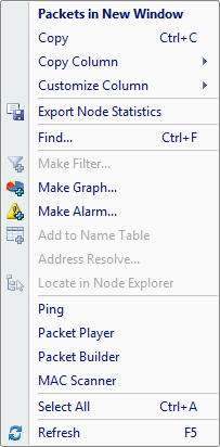 | Packets in New Window | Sends the packets relating to the selected node to a new packet decode window. |