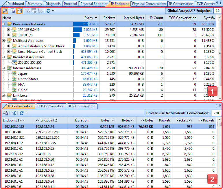Endpoints are all the objects communicating in the network. Capsa divides all nodes by physical address and IP address. This tab provides a great number of statistics on IP endpoints to help you find useful information on IP addresses. This tab contains the following components:
